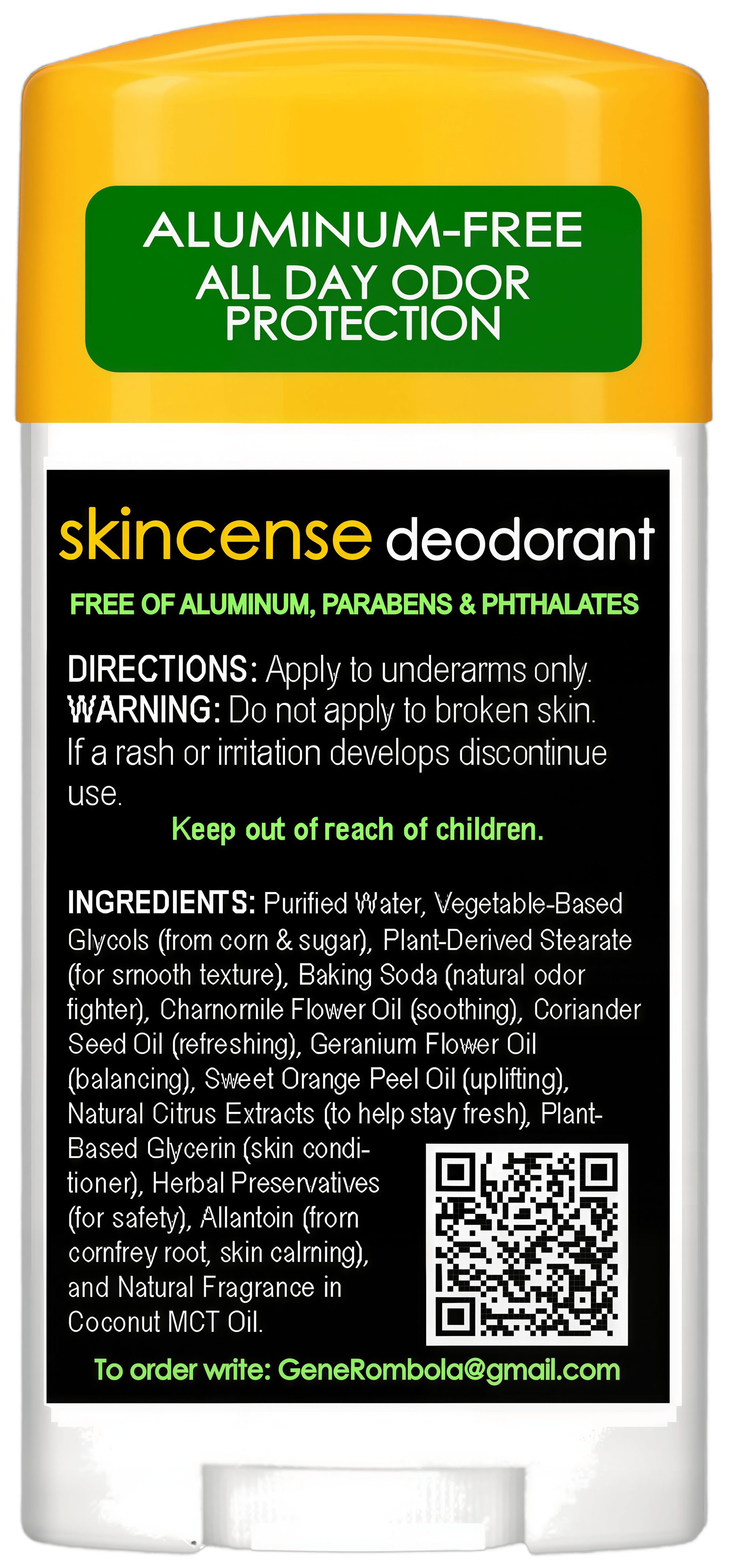 Skincense deodorants are individually handmade and contain NO Aluminum, NO Parabens, and NO Phthalates. We use essential plant oils that naturally destroy odor-causing bacteria on contact, combined with baking soda to extend effectiveness for 12 hours or longer.
