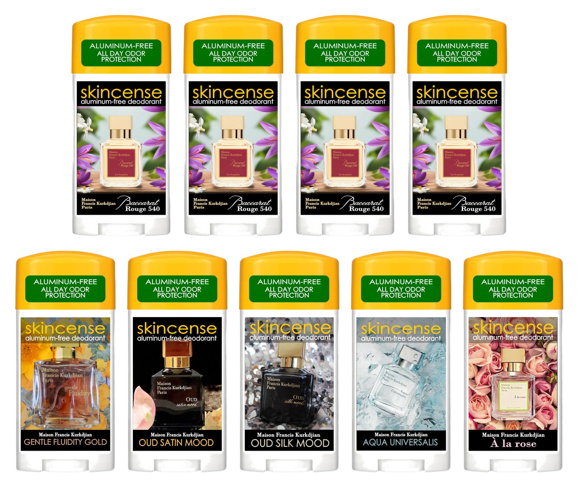Baccarat Rouge 540 - 4 Deodorant Sticks and 1 each of Oud Satin Mood, Oud Silk Mood, Aqua Universalis, A La Rose and Gentle Fluidity Gold.